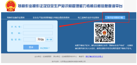 方法二:登錄應(yīng)急管理部政府網(wǎng)站(tttp://www.mem.gov.cn/),從“服務(wù)”中的“查詢服務(wù)進(jìn)入“特種作業(yè)操作證及安全生產(chǎn)知識(shí)和管理能力考核合格信息查詢平臺(tái)”,使用注冊(cè)并實(shí)人認(rèn)證的手機(jī)號(hào)登錄系統(tǒng),下載打印電子證書(shū)。