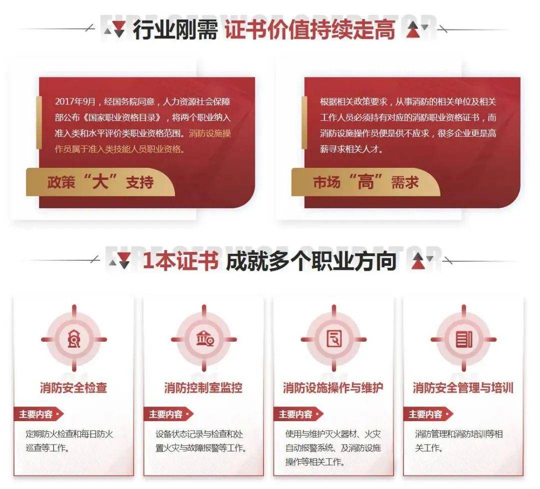 消防設施操作員證屬于準入類證書,需要持證上崗,考證相當于考飯碗;證書終身制,不需要需二次審核。崗位工作有人數底線設置,行業人力缺口極大。證書與國家職業資格等級相掛鉤,考下初級相當于國家職業資格五級。