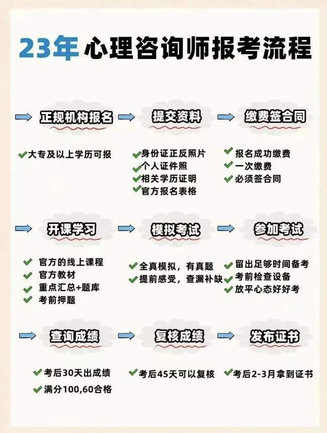 正規機構組織學員集體報名,不接受學員個人報名——機構整理報考資料——機構發送電子版《考生花名冊》,心理所進行資質初審(審核學時和作業成績)——根據初審通過的考生人數,統一繳納考試費——寄送報考資料到心理所。