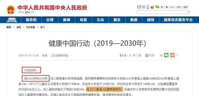 《健康中國行動》(2019—2030年),提出到2022年要求每萬人中有一名公共營養師(營養指導員)。