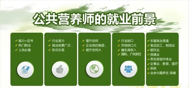 考取公共營養師能勝任在各級醫療衛生單位、各級食品衛生監督機構和各類餐飲業及食品加工流通企業、學校、幼兒園、企事業單位的公共食堂從事膳食營養的評價、管理和指導工作,以及營養食品教學、科研、食品衛生監督和檢測、營養咨詢等方面的工作。
