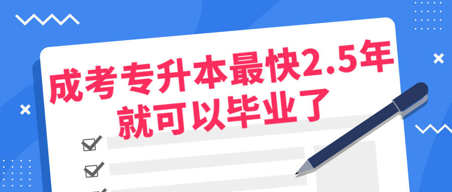 其實,成考專升本最快2.5年就可以畢業了,成人高考參加每年10月的國家統一的入學考試,取得錄取學校錄取通知書后,第二年3月開學,學習時間約2.5年。成人高考的學習形式包括函授、業余(夜大、半脫產)學習。